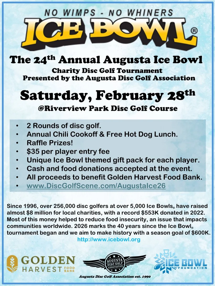 2026 ADGA ICE BOWL Saturday, February 28, 2026 9:30 AM 11:30 AM North Augusta, SC (map) Google Calendar ICS https://www.pdga.com/tour/event/99888